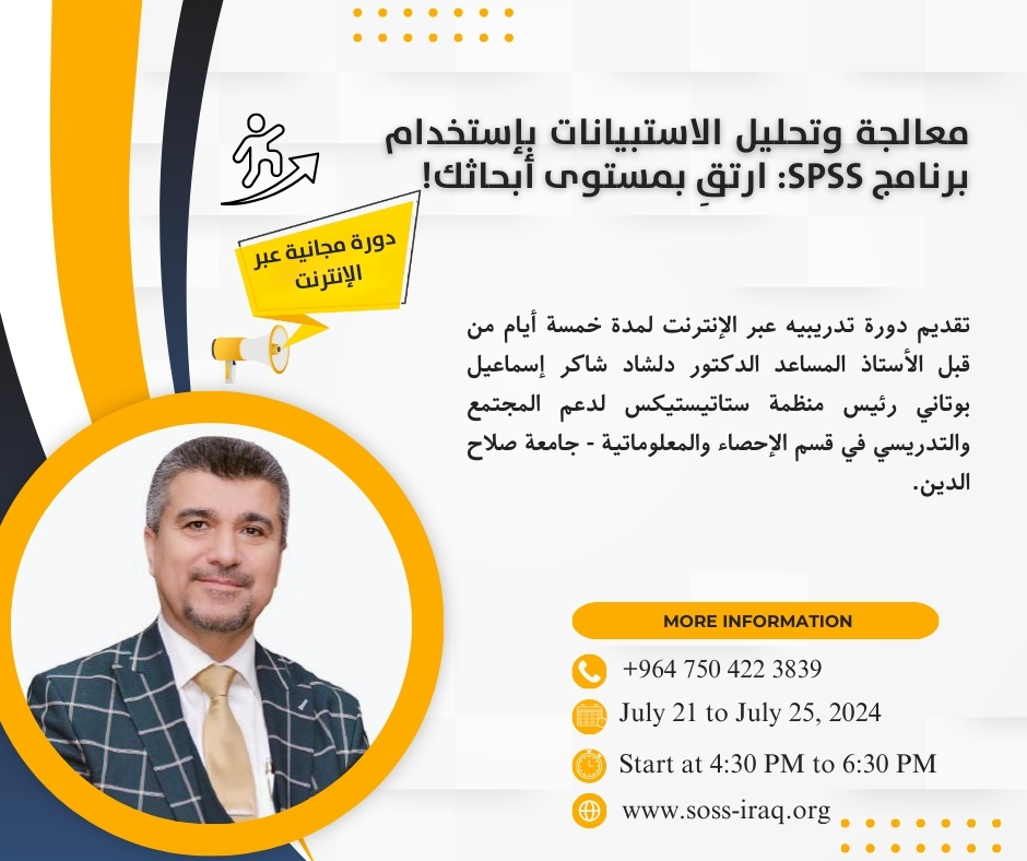 نظرة عامة تقدم SOSS دورة تدريبية مجانية عبر الإنترنت ، "معالجة الاستبيان وتحليله باستخدام SPSS: ارفع مهاراتك البحثية!" تم تصميم هذه الدورة لتزويد المشاركين بالمهارات ...